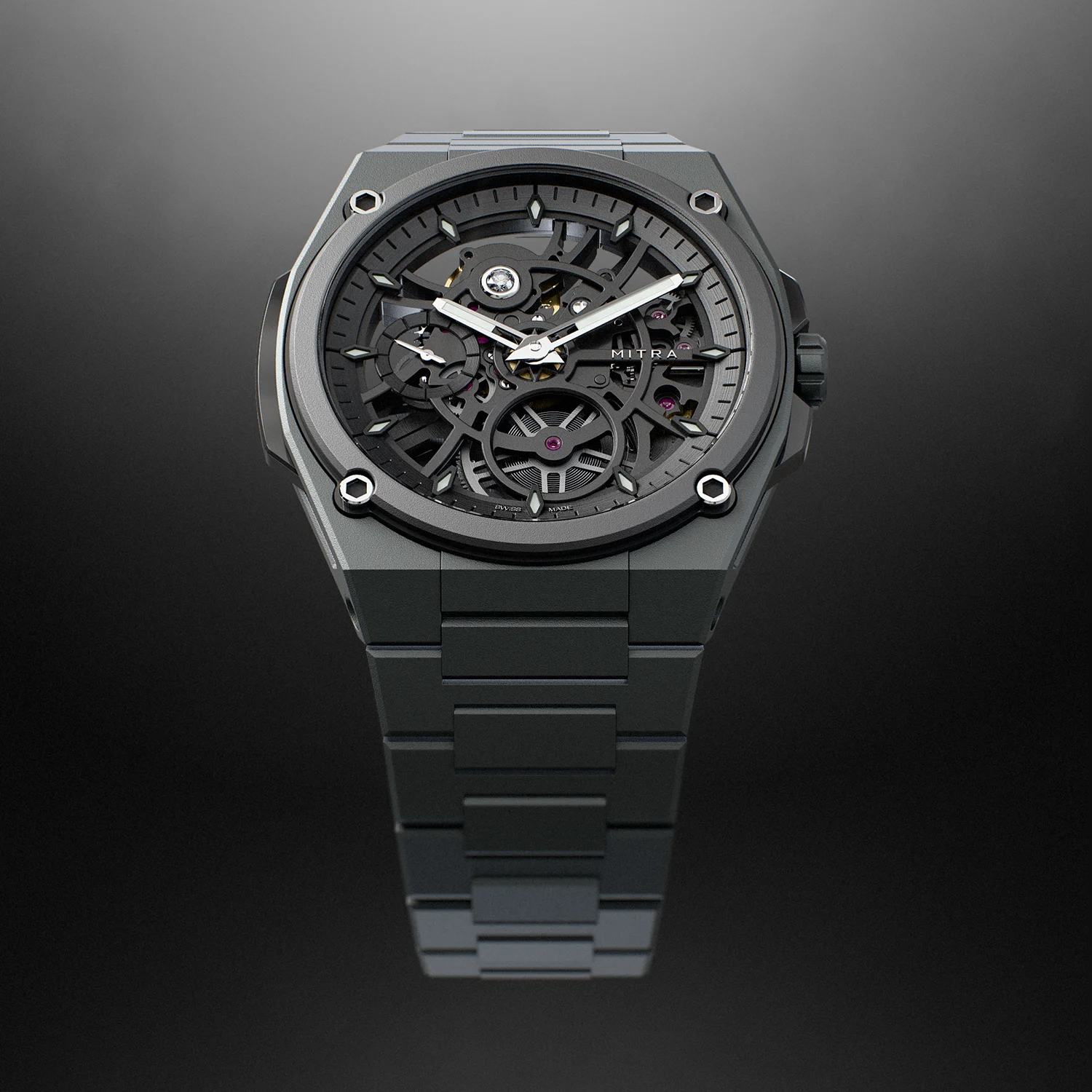 Cadran squeletté avec ponts traités anthracite, réhaut satinéanthracite, serti d’un diamant coupe FC, couleur GH, clartéVS1, taille 1,80 mm, aiguilles en forme d’épée et indexinspirés de vaisseaux spatiaux avec dépôt luminescentSuper-LumiNova bleu.